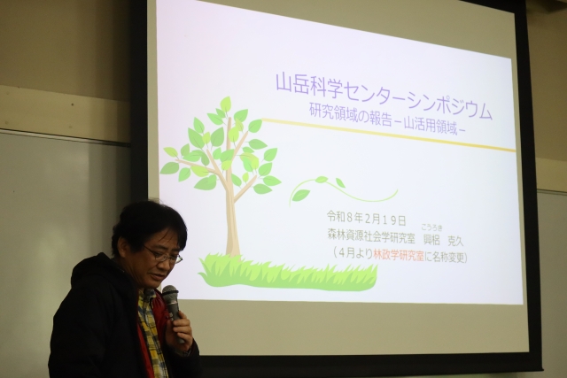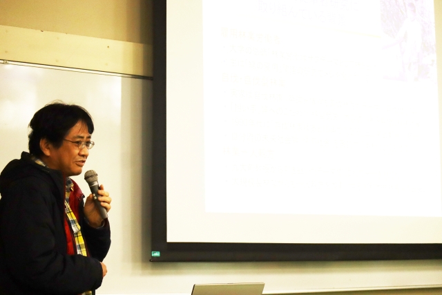引き続き、興梠克之 山岳科学センター准教授が「林業従事者像の再構成」のタイトルで研究を紹介しました。