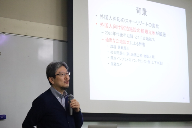 続いて、呉羽正昭 山岳科学センター長は「日本の国際スキーリゾートにおける新規宿泊施設の立地と環境管理」のタイトルで研究を紹介しました。
