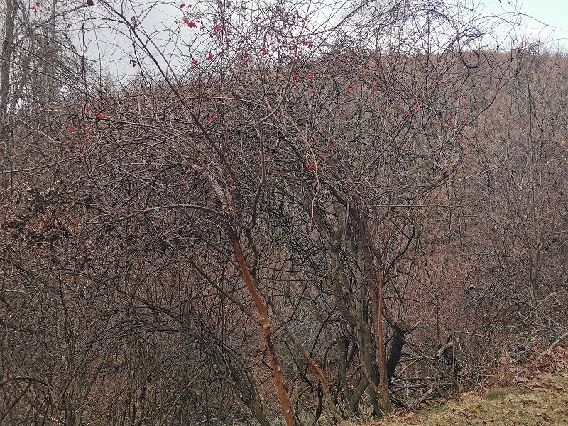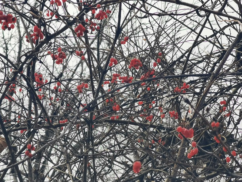 冬枯れの林内では何の気配もなく、ただただ茶色の風景が広がる中、小鳥たちに人気がないのか?灌木の赤い実がまだ目立っていました。