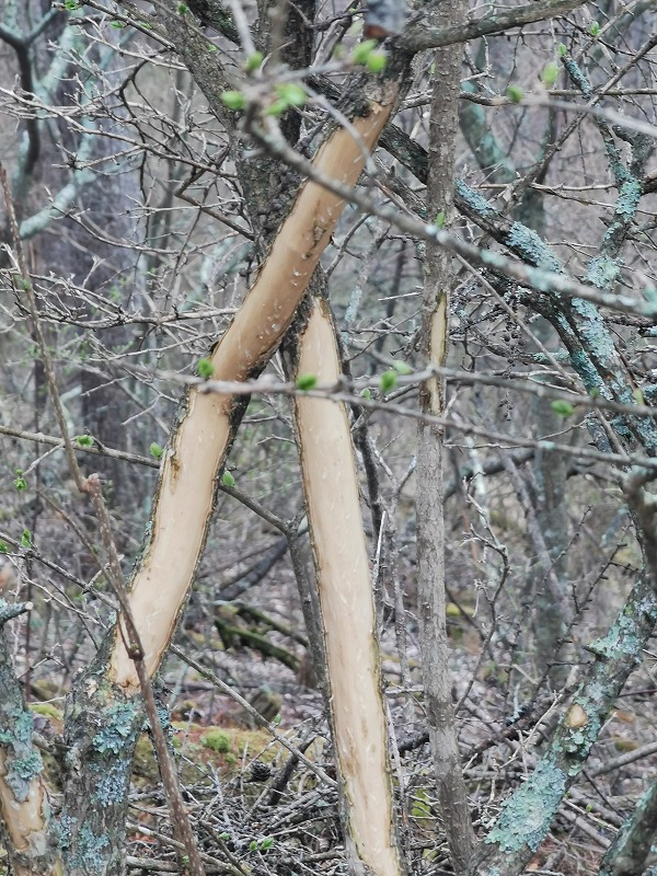新緑を野生動物も待ち望んでいると思われますが、開葉の為に水分を吸い上げた樹皮が美味しいのか?低木の剥皮害もあちらこちらで見かけます…