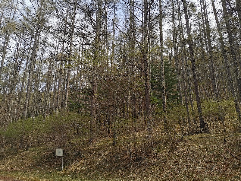 カラマツ植林地は低木が芽を吹き色付いて来ています。