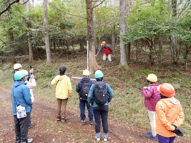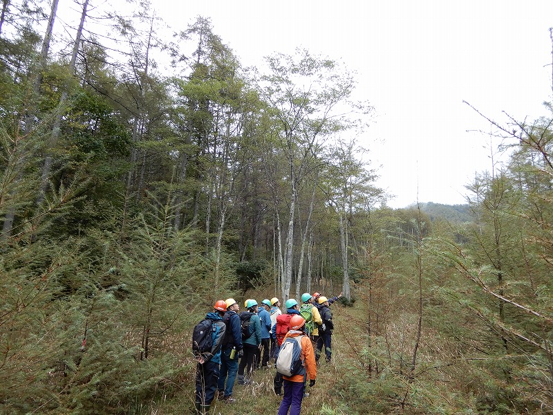 カラマツが少しずつ色付いているところや、ニホンジカによるカラマツ植栽木の獣害の状況もみて頂きました。