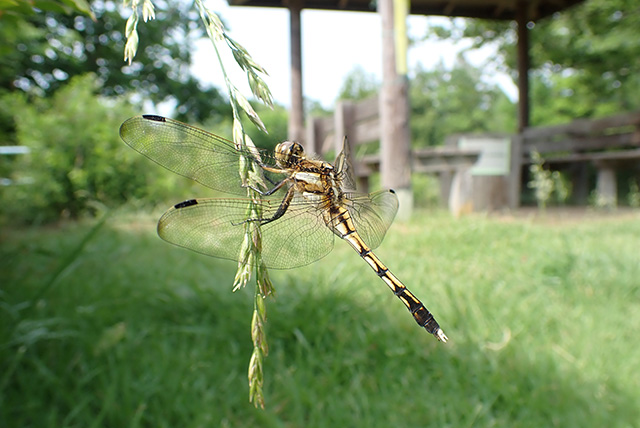 トンボが羽化し、数種類の成虫があちこちで飛んでいます。
