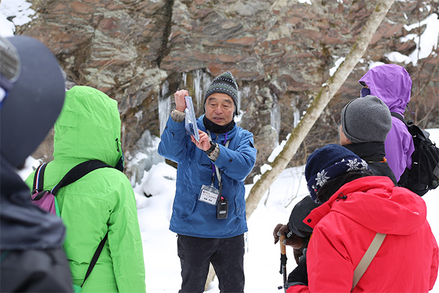 やがて一行は最奥の大明神の滝に到着しました。この滝は実験地内にあるため、自然観察会以外では非公開となっています。高さは10mほどあり、全面が凍っていましたが、氷の薄いところからはなかの水の流れが見え、耳を澄ますと水音も聞こえました。