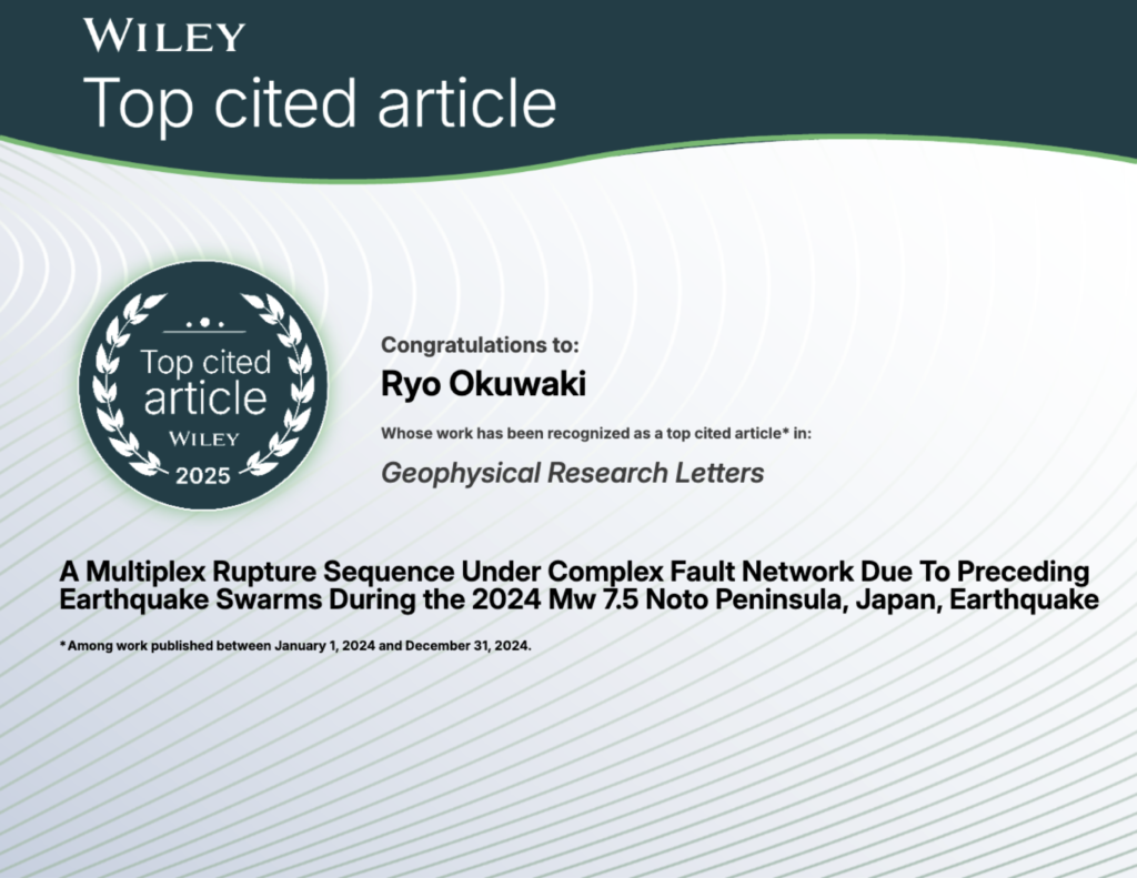 筑波大学生命環境系・山岳科学センターの奥脇 亮 准教授らの共同研究グループが発表した論文が、アメリカ地球物理学連合の論文誌 Geophysical Research Letters において、最も引用された論文 (上位10件) としてTop cited articleを受賞しました。
